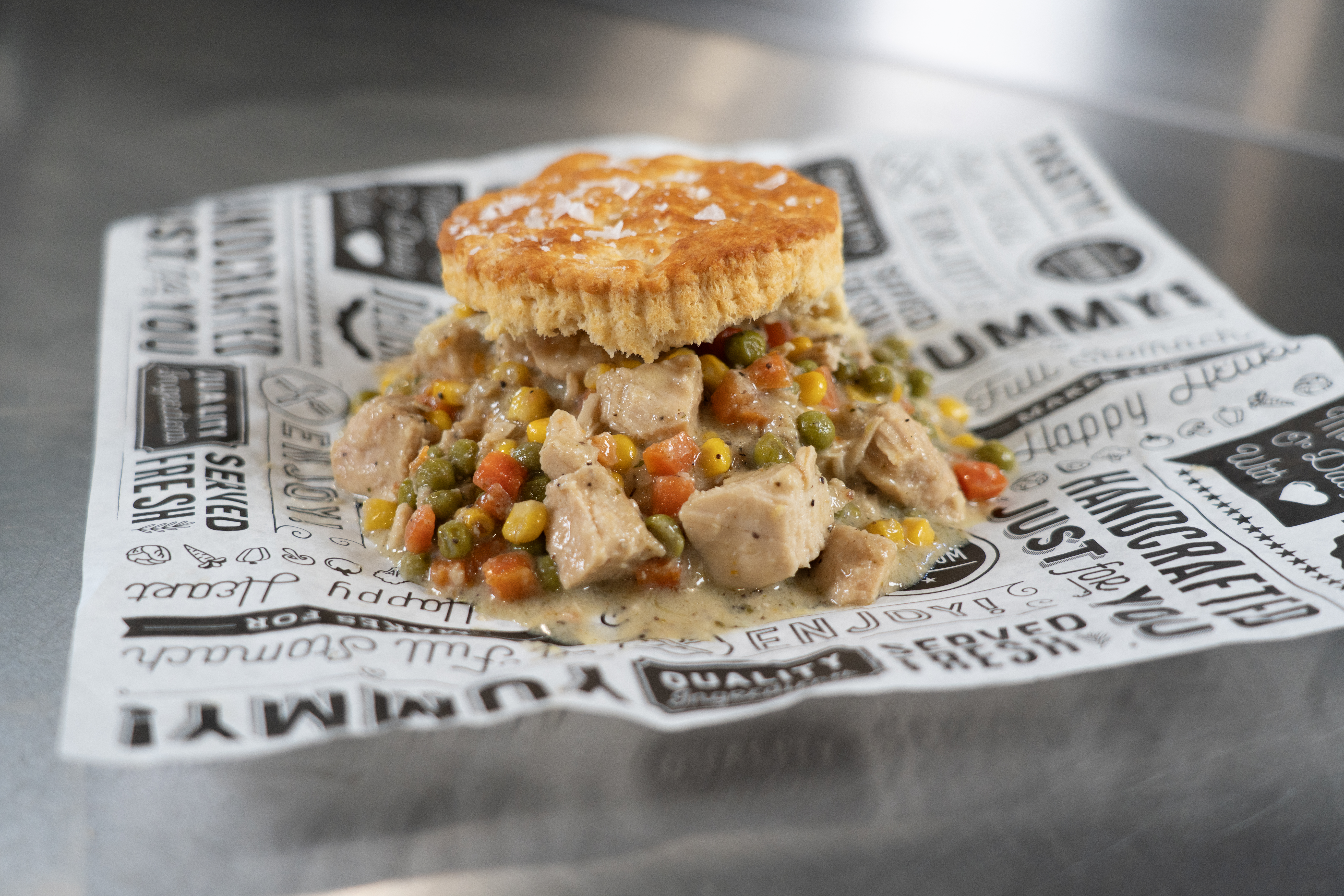 Comfort food that feels like a hug. Homemade chicken stock, perfectly seasoned chicken, buttered vegetables in a creamy sauce. Rivals the O.G. as our #1 seller.